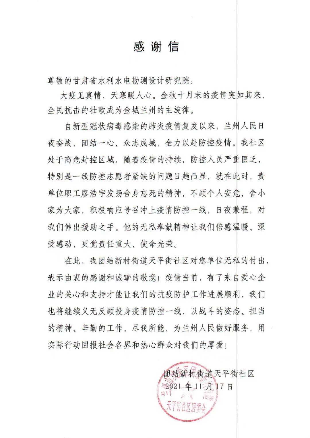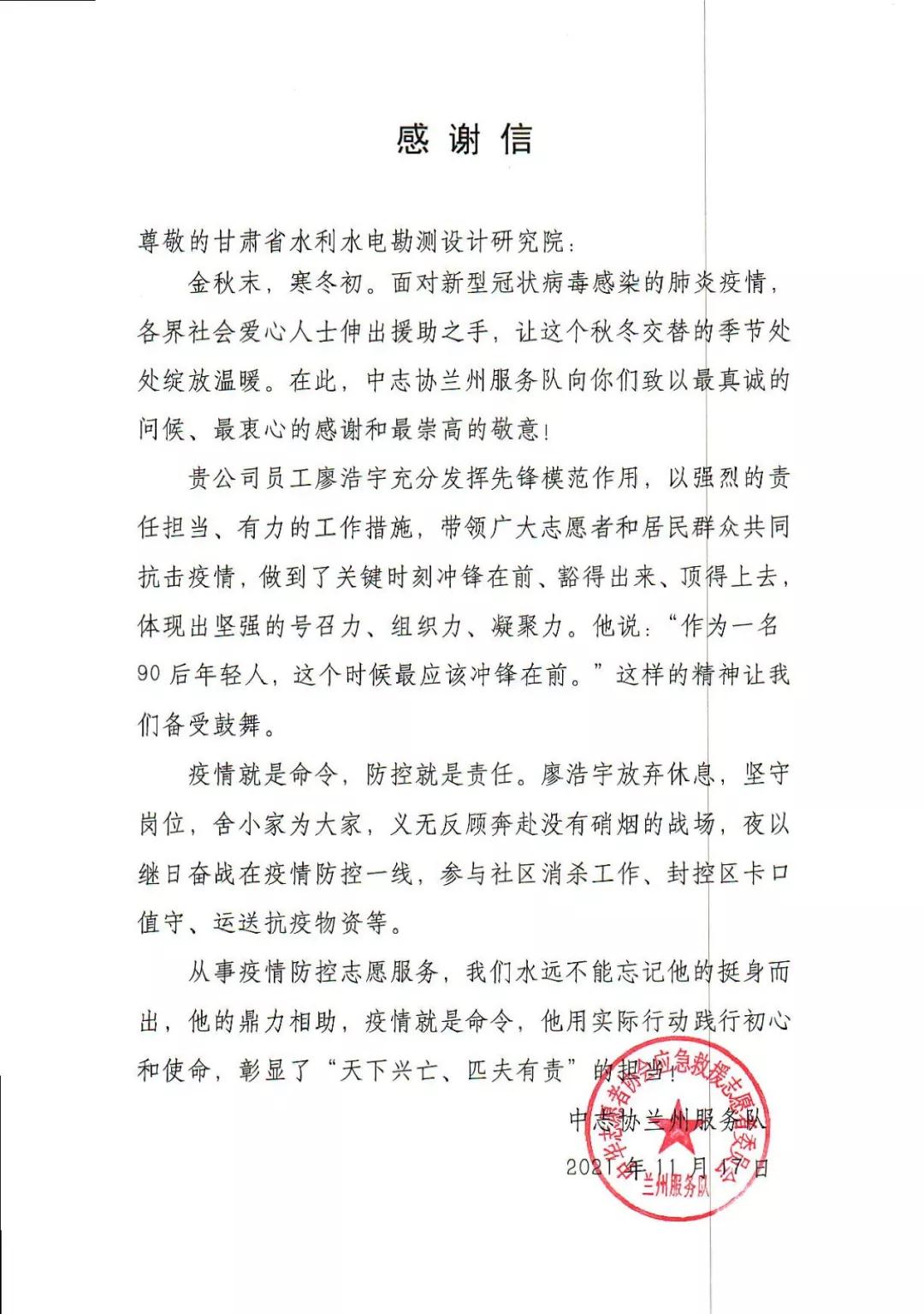 近日,水电设计院收到中志协兰州服务队和团结新村街道天平街社区发来的感谢信。信中对水电设计院规划院员工廖浩宇在此次疫情发生后,主动请缨参加疫情防控服务工作,甘当疫情防控最美逆行者,持续坚持26天志愿者服务的先进事迹表示感谢。