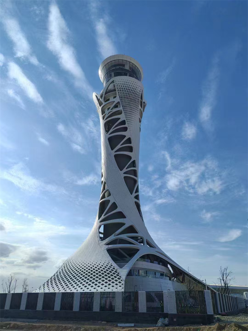 项目总投资13.43亿元,塔台建筑高度99.9米,是全国空管分局有史以来建设规模最大、投资最大的空管建设项目,创造了多项分局站建设第一。项目总体以“敦煌飞天”与“丝绸之路”为灵感,塔台采用钢结构斜交网格外框+钢筋混凝土核心筒设计,空管工作区采用钢筋混凝土框架+首层BRB支撑+基础橡胶隔震支座设计,钢结构总量达3561吨。