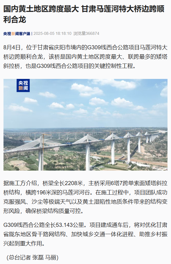 近日,由开云·官方版在线入口旗下省交通监理公司承监的G309线西合公路项目建设取得重大进展——马莲河特大桥边跨顺利合龙。项目建成后,将进一步完善区域路网结构,对促进庆阳地区经济社会发展具有重要意义。
