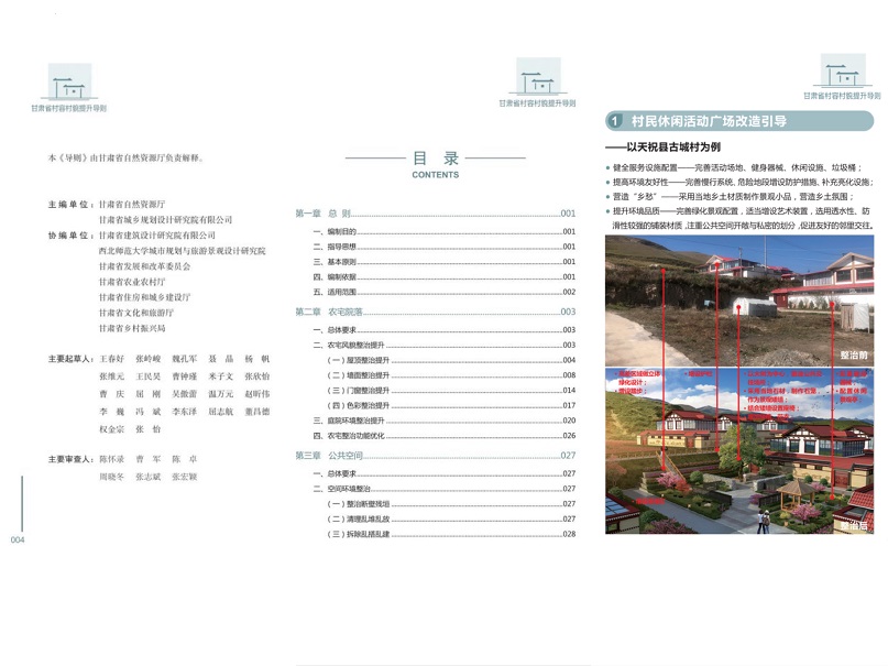 《导则》成果分为提升指引和示例图集两部分。提升指引部分以文字形式明确了甘肃省村容村貌整治提升的要求和内容,包括总则、农宅院落、公共空间、道路街巷、绿化美化、环境卫生、村落保护、保障机制和附录等9个章节,对全省5个国家级历史文化名村和54个传统村落实行特殊保护;示例图集部分以图文形式提出了村容村貌提升的多种、可选处理方法和典型案例,主要包括农宅院落、公共空间、道路街巷、绿化美化、环境卫生、村落保护等6部分内容。