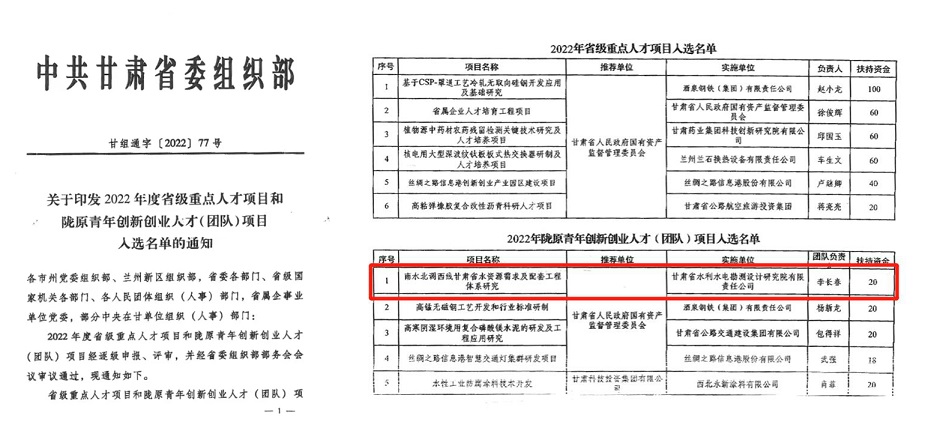 近日,省委组织部印发了《2022年度省级重点人才项目和陇原青年创新创业人才(团队)项目入选名单》,甘肃省水利水电勘测设计研究院有限责任公司申报的《南水北调西线甘肃省水资源需求及配套工程体系研究》成功入选“2022年陇原青年创新创业人才(团队)项目”,是集团公司唯一入选项目。
