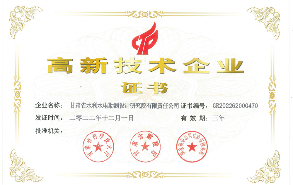 日前,甘肃省水利水电勘测设计研究院有限责任公司获得甘肃省科技厅、甘肃省财政厅、国家税务总局甘肃省税务局联合颁发的“高新技术企业证书”(证书编号:GR202262000470),标志着水电设计院正式迈入国家高新技术企业行列,是企业发展的又一个重要里程碑。