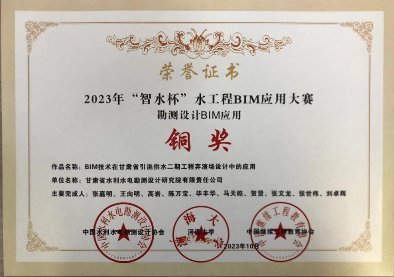 近日,中国水利水电勘测设计协会发布了2023年“智水杯”水工程BIM应用大赛获奖项目,省水电设计院申报的《BIM技术在甘肃省引洮供水二期工程弃渣场设计中的应用》获得勘测设计MIM应用铜奖。