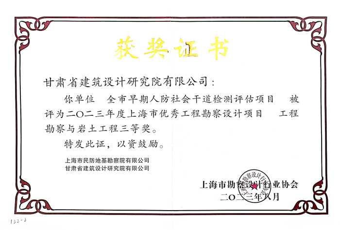 本次获奖项目由省建筑设计院检测中心联合上海市民防地基勘察院有限公司,就兰州市七八十年代人防社会干道开展检测鉴定。项目获奖,彰显了省建筑设计院在工程勘察设计和检测鉴定方面的创新能力和技术水平,也是对公司检测业务板块整体运营效率、综合服务能力的再一次肯定。
