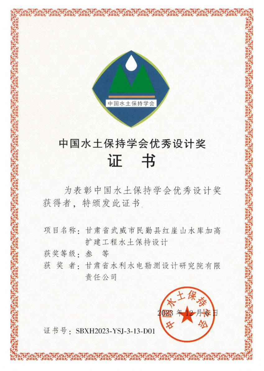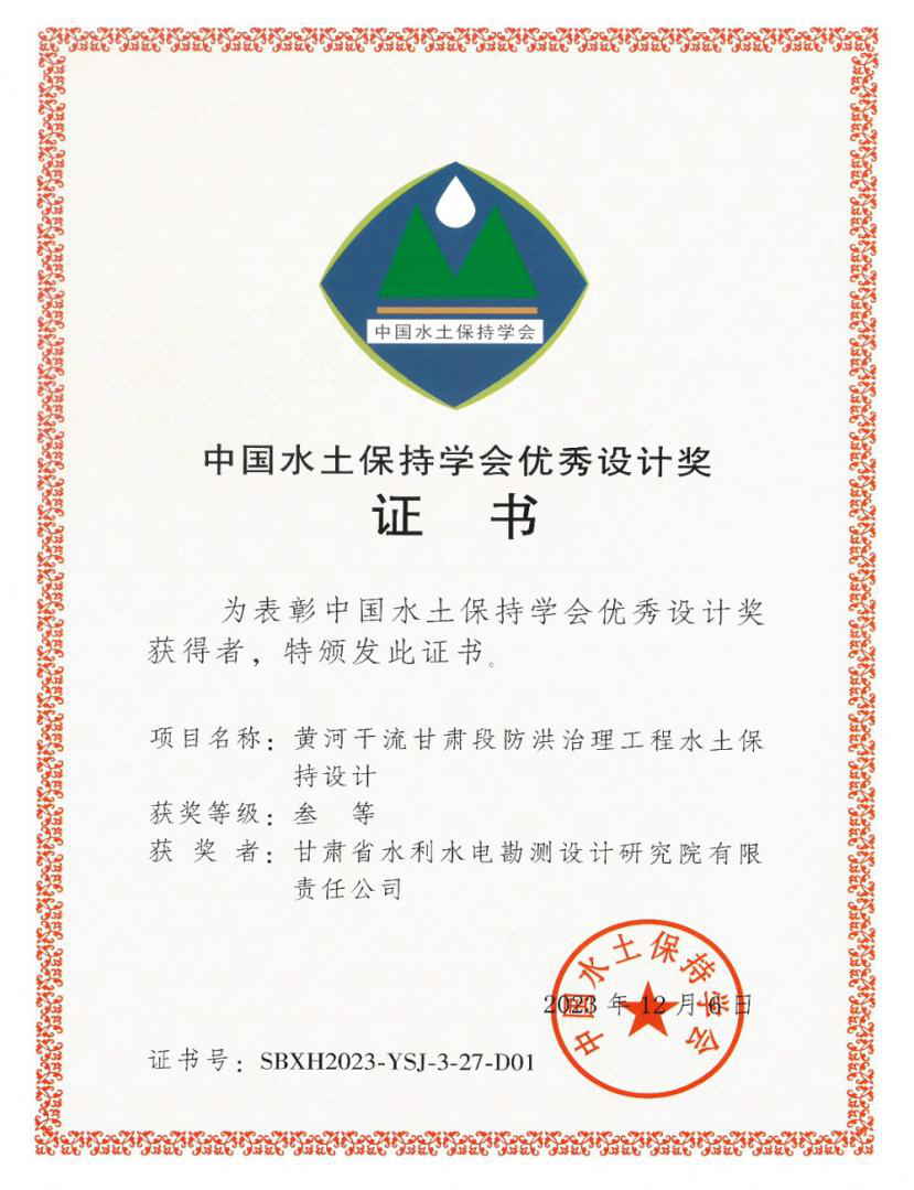 据悉,这是继《甘肃省引洮供水一期工程水土保持设计》获第三届中国水土保持学术大会优秀设计二等奖后,再次喜获此奖项。中国水土保持学术大会制度自2018年建立以来,中国水土保持学会搭建了我国水土保持领域规模最大、水平最高的学术交流平台,现已成为中国水土保持学术交流的重要品牌。中国水土保持学会优秀设计奖每两年评选一次,主要奖励我国在水土保持规划与设计领域中技术先进、成效显著、理念创新的项目成果。